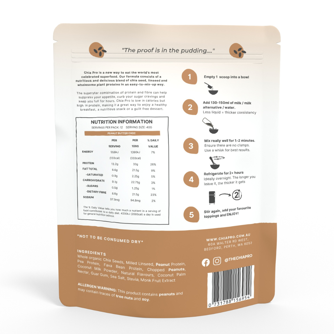 CHIA PRO felt that it was obligatory to create a healthy twist on your favourite childhood flavour, peanut butter & chocolate. Your cravings will be satisfied while you achieve all of your health and fitness goals!